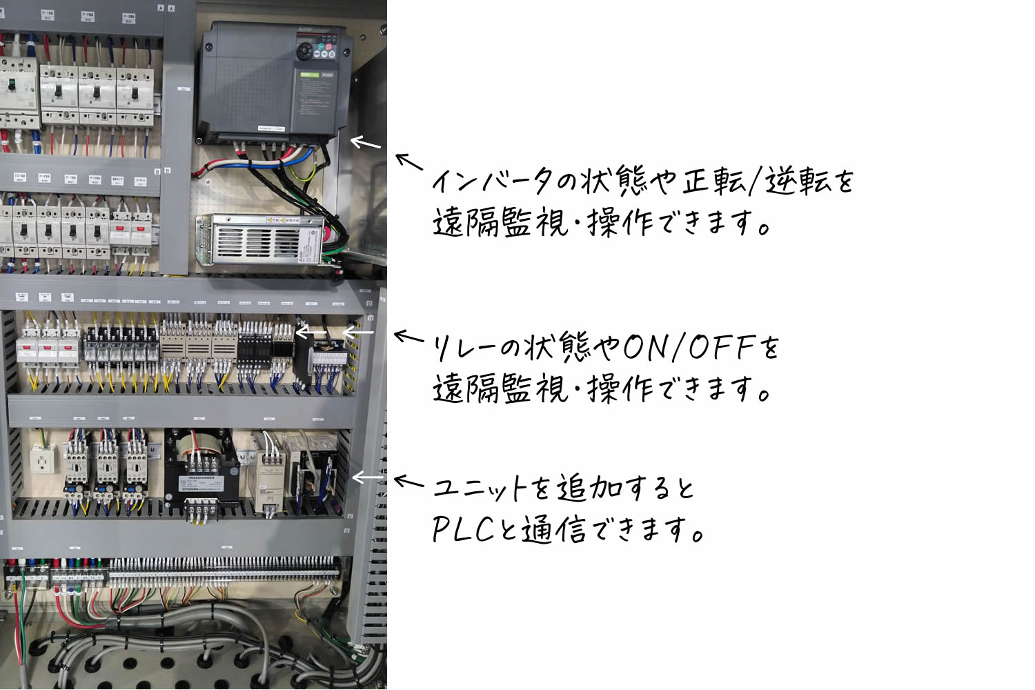 既存制御盤の運転や異常といった接点の入出力から、温度や圧力のアナログ入出力まで、幅広い信号をカスタマイズして遠隔監視・操作できます。