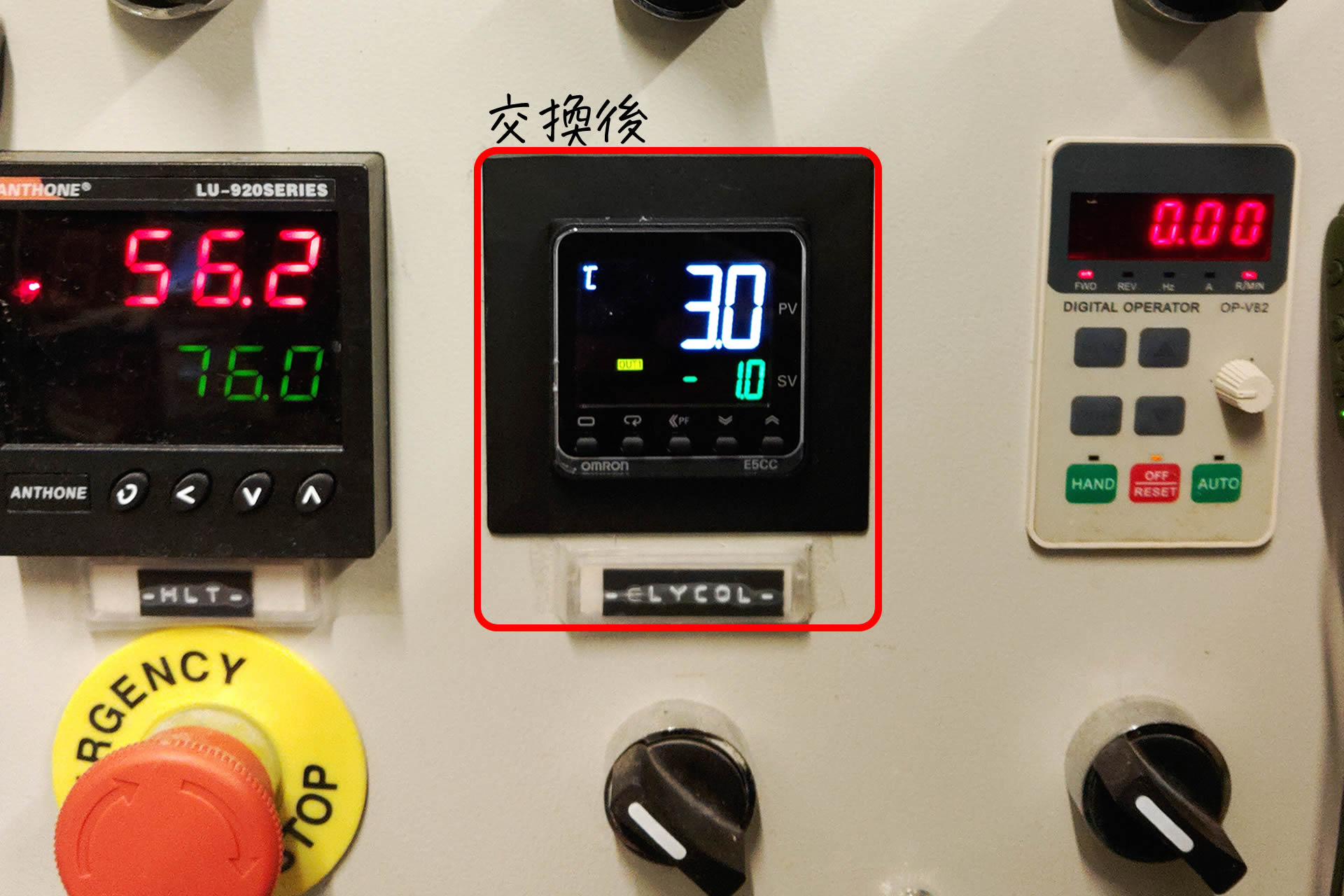 まったく馴染みのないANTHONEの温度指示計(廃番)を、既存の配線と仕様に影響がないように伝送出力がある京都サンガF.C.のオフィシャルスポンサーOMRONの温度指示計に交換しました。